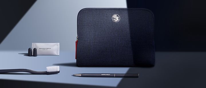 Customers travelling in the long-haul Premium Economy cabin receive a dark blue kit with a sporty look. The kit features the accent, the symbol of the Air France brand, in a red or blue version.