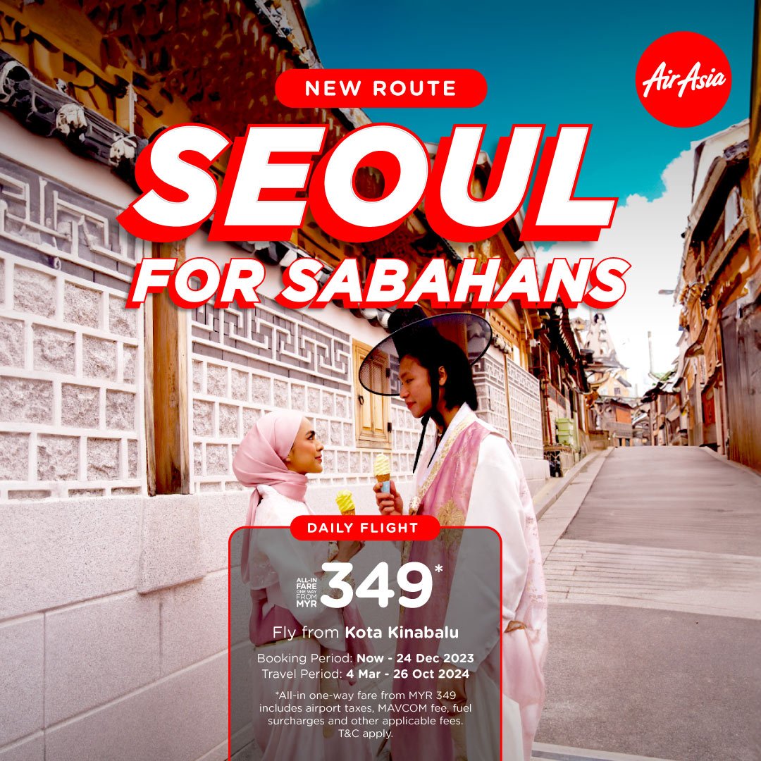 As part of the route launch, AirAsia is offering special promotional fares for travellers from Kota Kinabalu to Seoul with all-in* fares from RM349 one-way. The promotional fare is available for booking on airasia Superapp and the website starting today until 24 December 2023 for the travel period between 4 March and 26 October 2024.