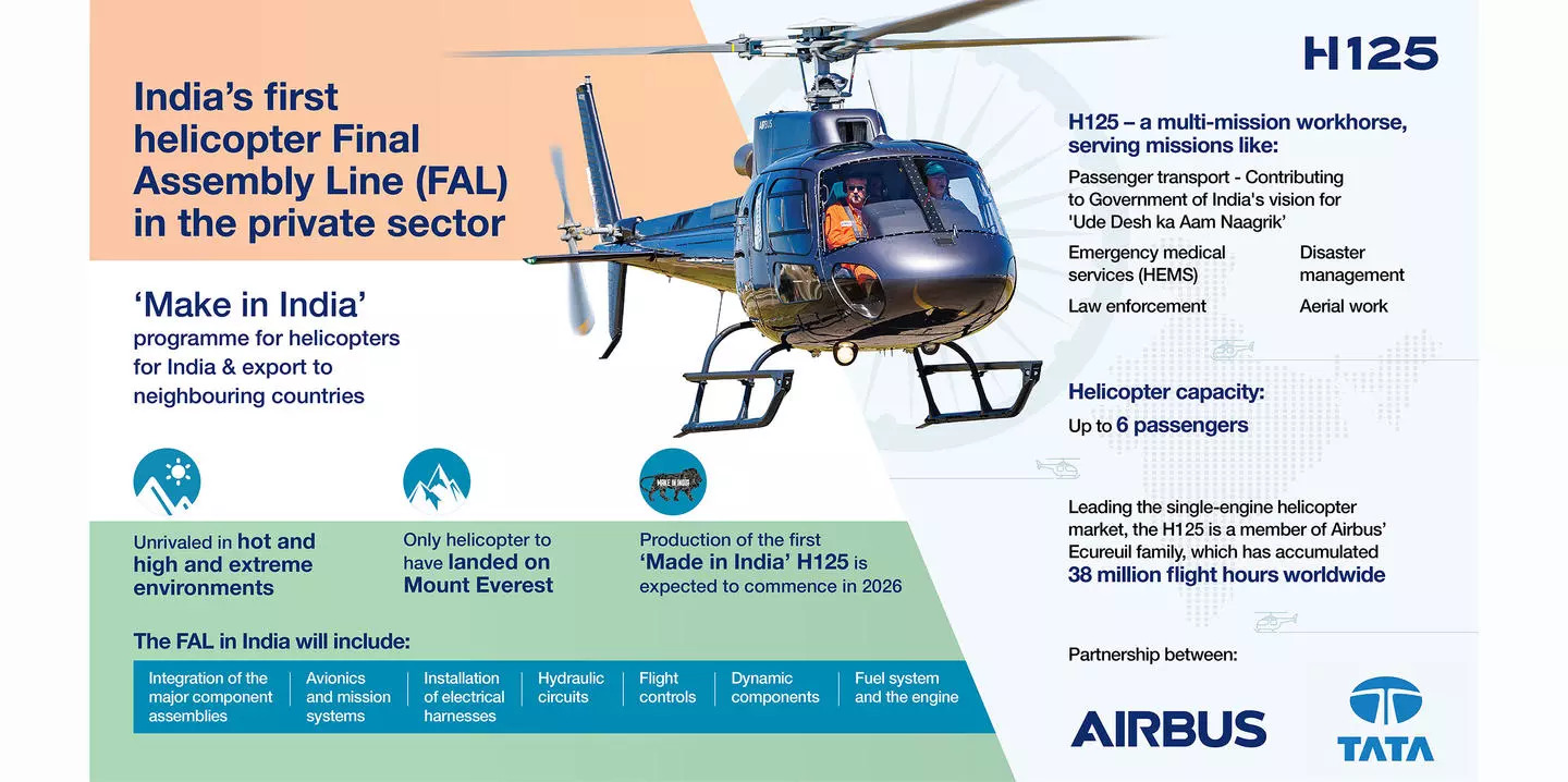 The FAL in India will undertake the integration of the major component assemblies, avionics and mission systems, installation of electrical harnesses, hydraulic circuits, flight controls, dynamic components, fuel system and the engine. It will also do testing, qualification, and delivery of the H125 to customers in India and the region. The FAL will take 24 months to set up and deliveries of the first ‘Made in India’ H125s are expected to commence in 2026. The location of the FAL will be jointly decided by Airbus and the Tata Group.