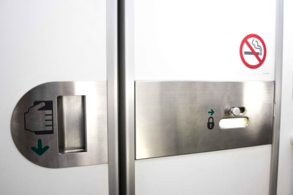 The new lavatory door is equipped with a large inner door locking knob and an additional handle so that passengers can use their elbows to unlock the door. Because the door mechanism is different to those found on other aircraft, signage has been placed near the lavatory to provide operational instructions.