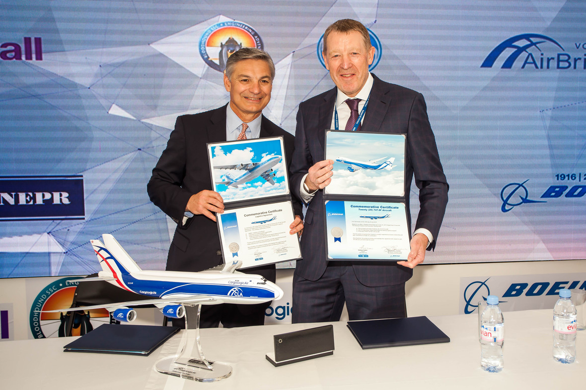 Image: Boeing’s Ray Conner (left) and Alexey Isaikin of Volga-Dnepr Group with the commemorative certificates signed today at Farnborough International Airshow to mark contracts covering long-term logistics support and the Group’s order for 20 747-8 Freighters.