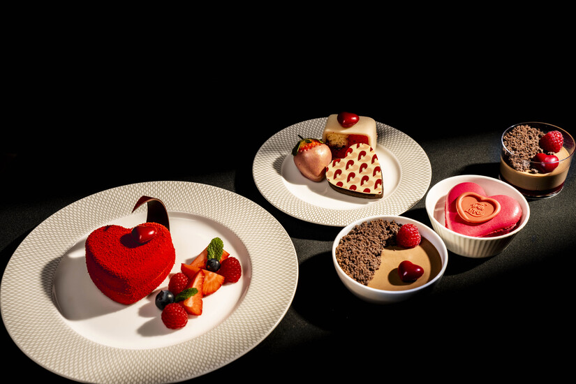 - White chocolate mousse heart with passion fruit and mango: A red chocolate-coated heart with a white chocolate, mango and passion fruit mousse, complemented by fresh berries, exclusively for those travelling in First.