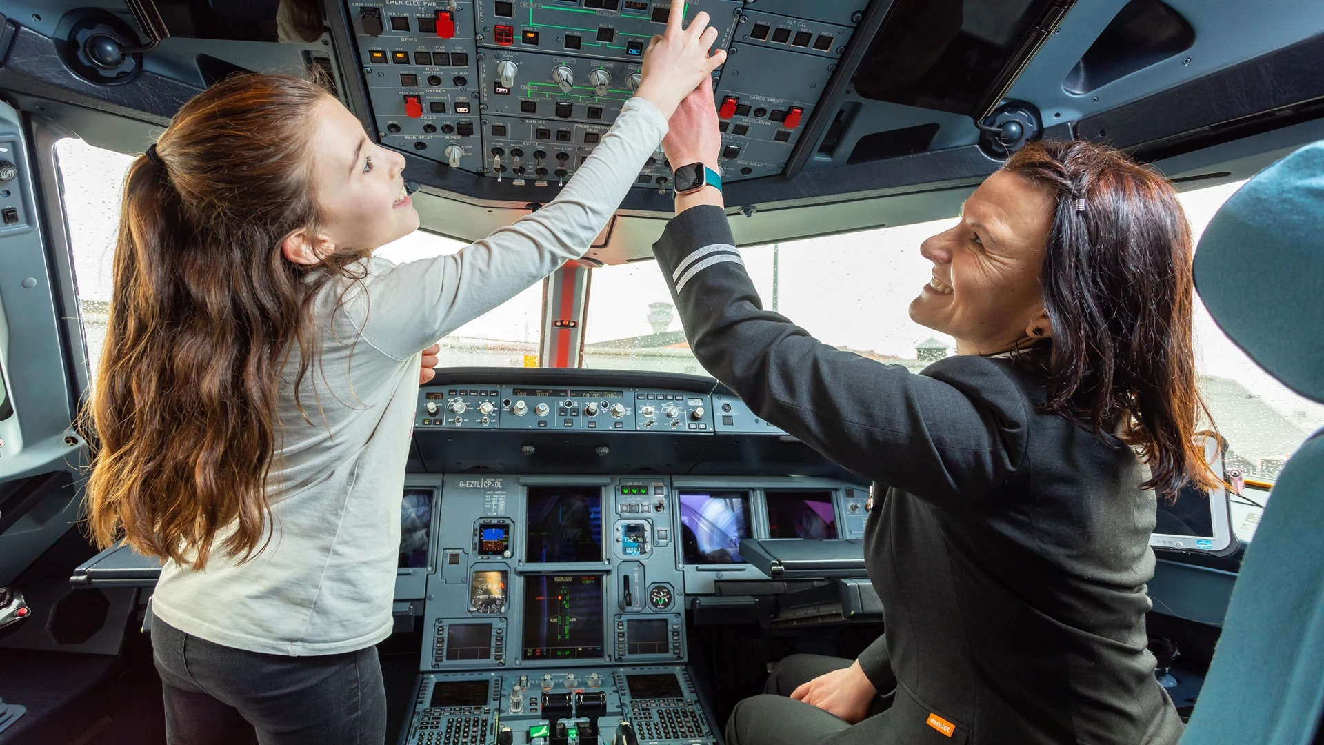 First Officer Debbie Thomas, an airline pilot at easyJet and former engineer, was joined by 10 year old daughter Harriet for a day at Luton airport where the pair explored Debbie’s office – the flight deck of an A320 easyJet aircraft. Harriet was shown the controls by her mum and practiced making a pilot’s passenger announcement.