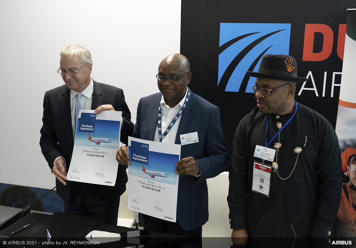 Akwa Ibom state government owned airline in Nigeria, Ibom Air has signed a firm order for ten (10) A220s at the Dubai Airshow. The signing was done by Mfon Udom, the chief Executive Officer of Ibom Air, and Christian Scherer, Chief Commercial Officer and Head of Airbus International in the presence of the Akwa Ibom state Governor, Mr. Udom Gabriel Emmanuel.