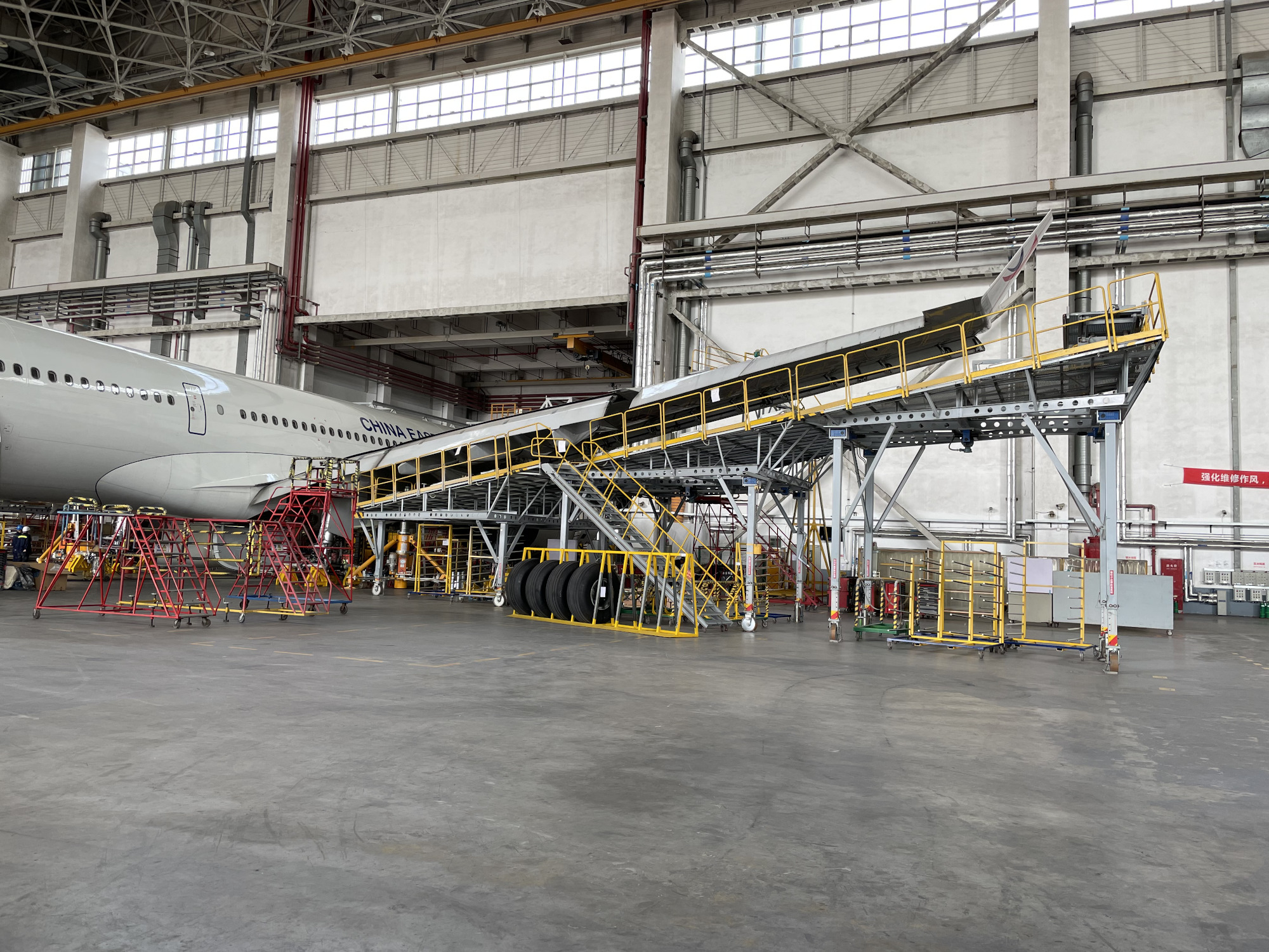 It consists of a large wing outer platform, a wing tip platform, a large wing intermediate platform, a large wing inner platform, a landing gear platform, an engine inner platform and an engine outer platform. The whole large wing dock is fully covered, and the jacks of each part can be avoided to meet the needs of the maintenance and repair of the big wing and the polishing and painting work.