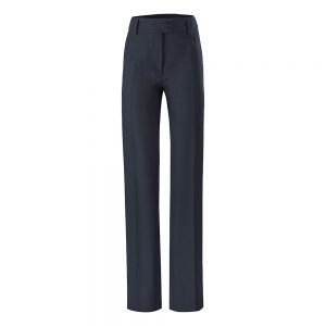 Women’s high waist pants. Semi-doubled in front. Wide belt with a 3.5cm extension closed by 2 buttons. 5 belt loops. 2 front and 2 back welt pockets with simple piping and ribbed stitching all around. Broken folds on the middle of legs in front and back. Bottom inside waistband finished with red piping, zip + buttons. Italian pockets. Marked folds. Clamps. Piped pockets