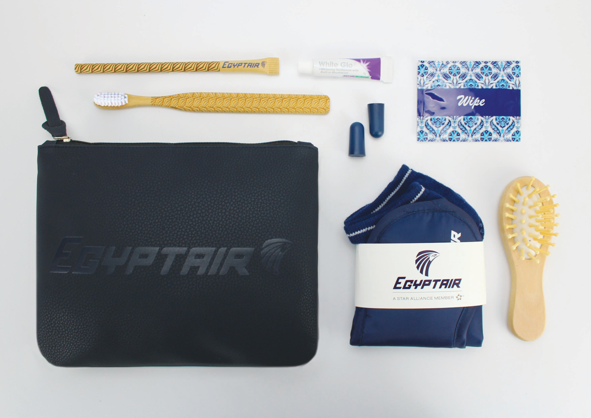 The new BC Class Medium Haul kit for Egyptair includes traditional comforts items such as eyeshade, socks with an anti-slip wrapped in a paper band, earplugs, wipes. The toothbrush and hairbrush are made in sustainable wood, customers can enjoy bringing them at and reuse for other occasions. Distinctive characteristic is the soft pouch. The peach skin awakens the tactual senses of passengers, provide them a feeling of softness and comfort.
