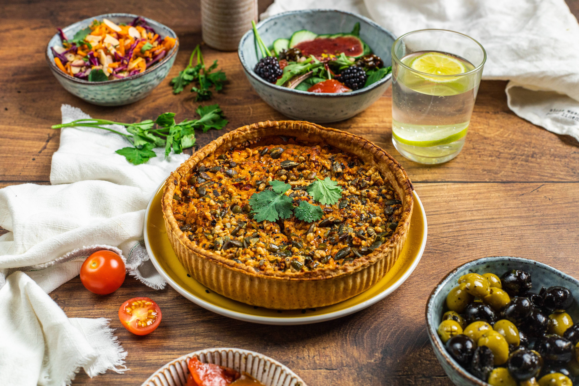Harissa spiced red pepper and cauliflower give this sharing quiche a tingle on the tongue and a lot of flavour. Packed with plants and dressed to impress, its sure to wake up the tastebuds.