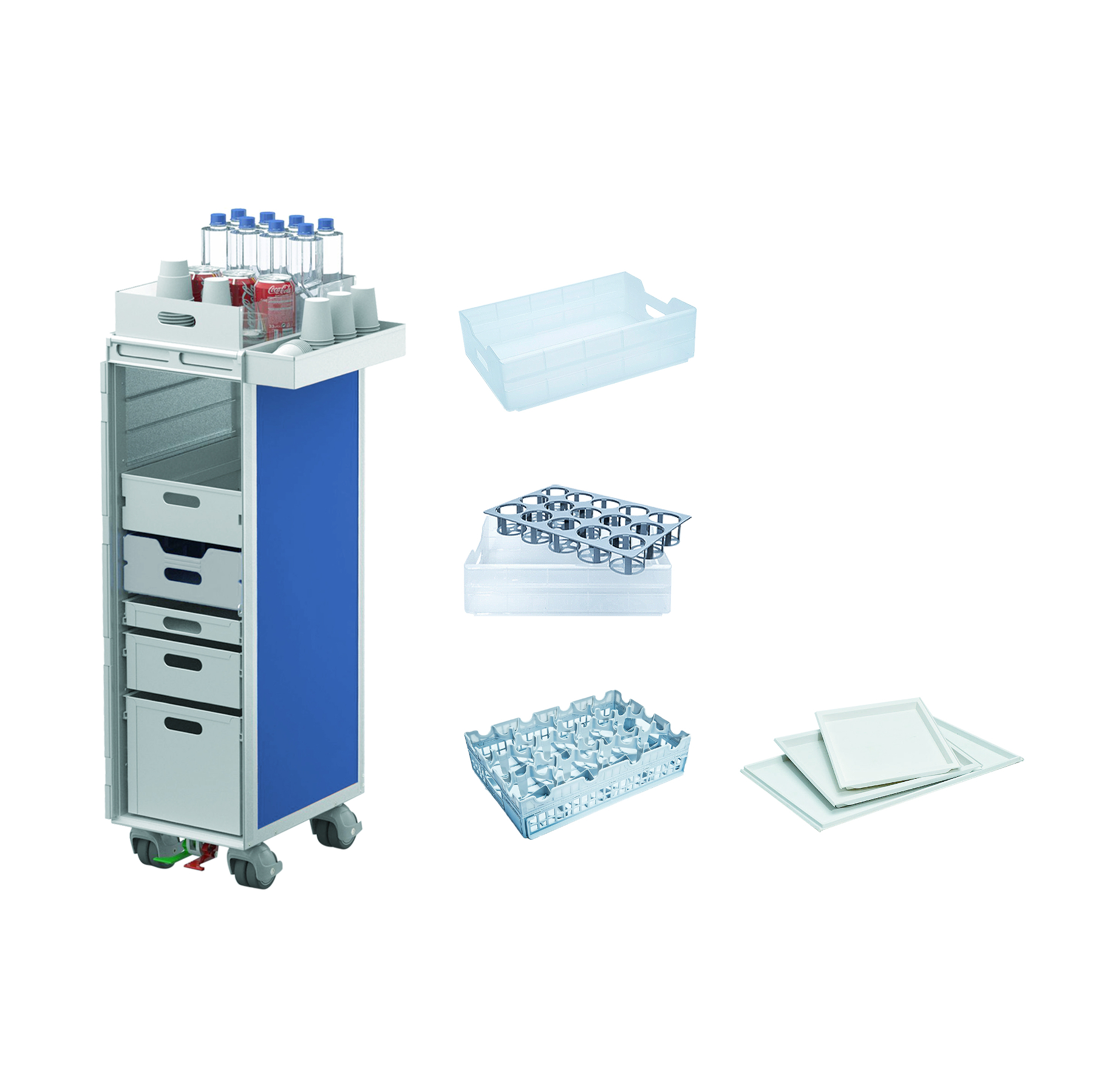 1/2 and Full Size Atlas Trolley Cart including Plastic and Aluminum Altas Drawers, Trays, all fit in. The other designs of Glass/Coffee Cup Rack Drawer, Altas Size, make the meal-cart space more well-organized and clean.