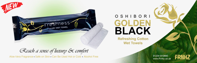 We feel privileged in introducing our newly landed Golden Black Oshibori Wet Towel. It’s a Luxury Aloe scented Cotton Rolled up wet towel which is particularly suitable for Airlines, Restaurants, Hotels, Spas, B&B, Takeaways, Meeting rooms, Receptions, & Caterers .