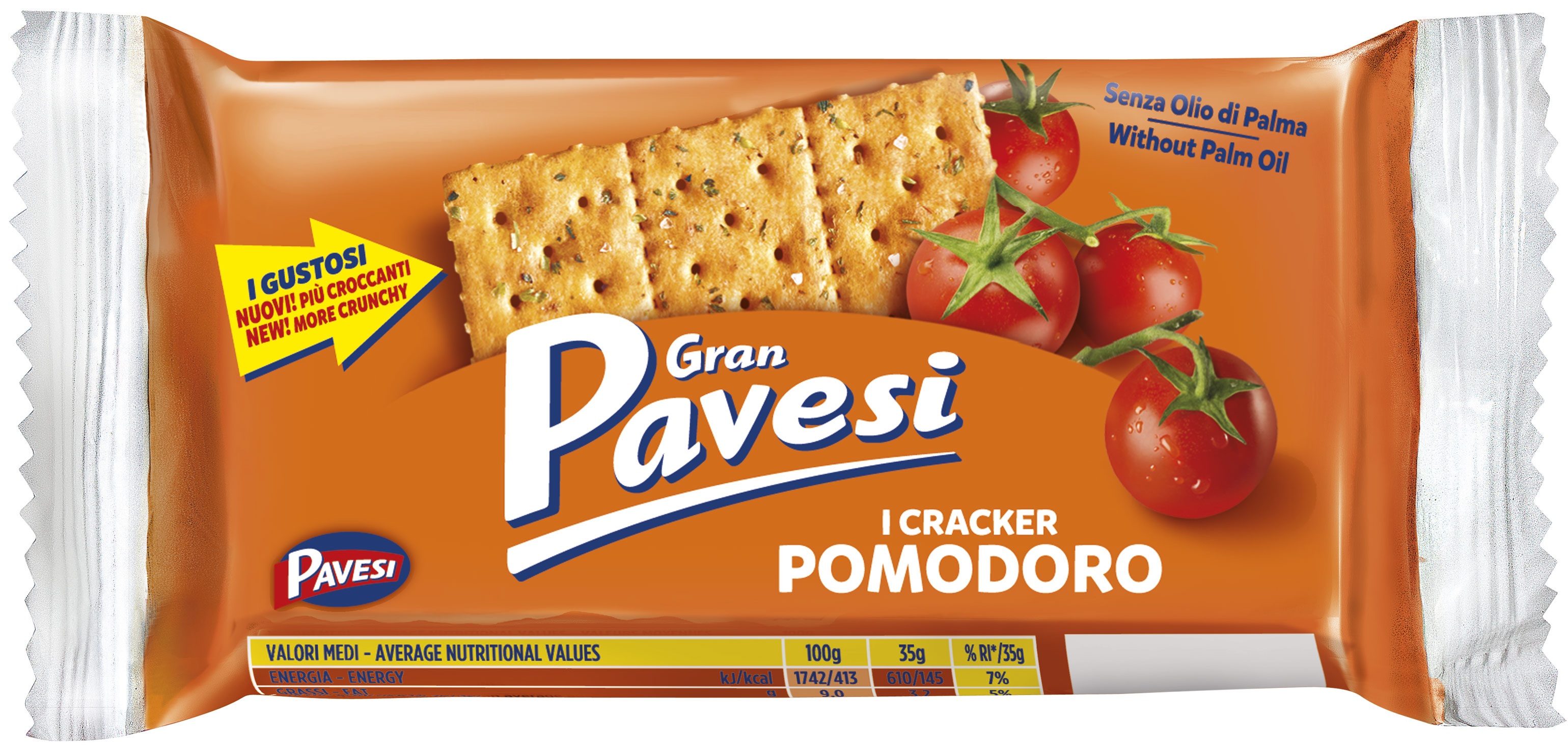 Gran Pavesi al Pomodoro e Formaggio are crackers that combine the simplest of Mediterranean flavours: tomatoes, Parmesan cheese, extra virgin olive oil.