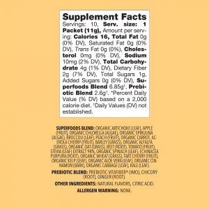 SUPERFOODS BLEND: Organic Artichoke (Leaf), Apple (Fruit), Organic Chlorella (Algae), Organic Spirulina (Algae), Broccoli (Leaf), Peach (Fruit), Organic Carrot, Acerola Cherry (Fruit), Barley (Grass), Organic Alfalfa (Grass), Organic Oat (Grass), Beet (Root), Tomato (Fruit), Stevia (Leaf) Extract 98%, Organic Spinach (Leaf), Echinacea Purpura (Root), Organic Wheat (Grass), Tart Cherry (Fruit), Organic Kelp (Leaf), Organic Aloe Vera (Leaf), Organic Cinnamon (Bark), Organic Cabbage (Leaf), Kale (Leaf).