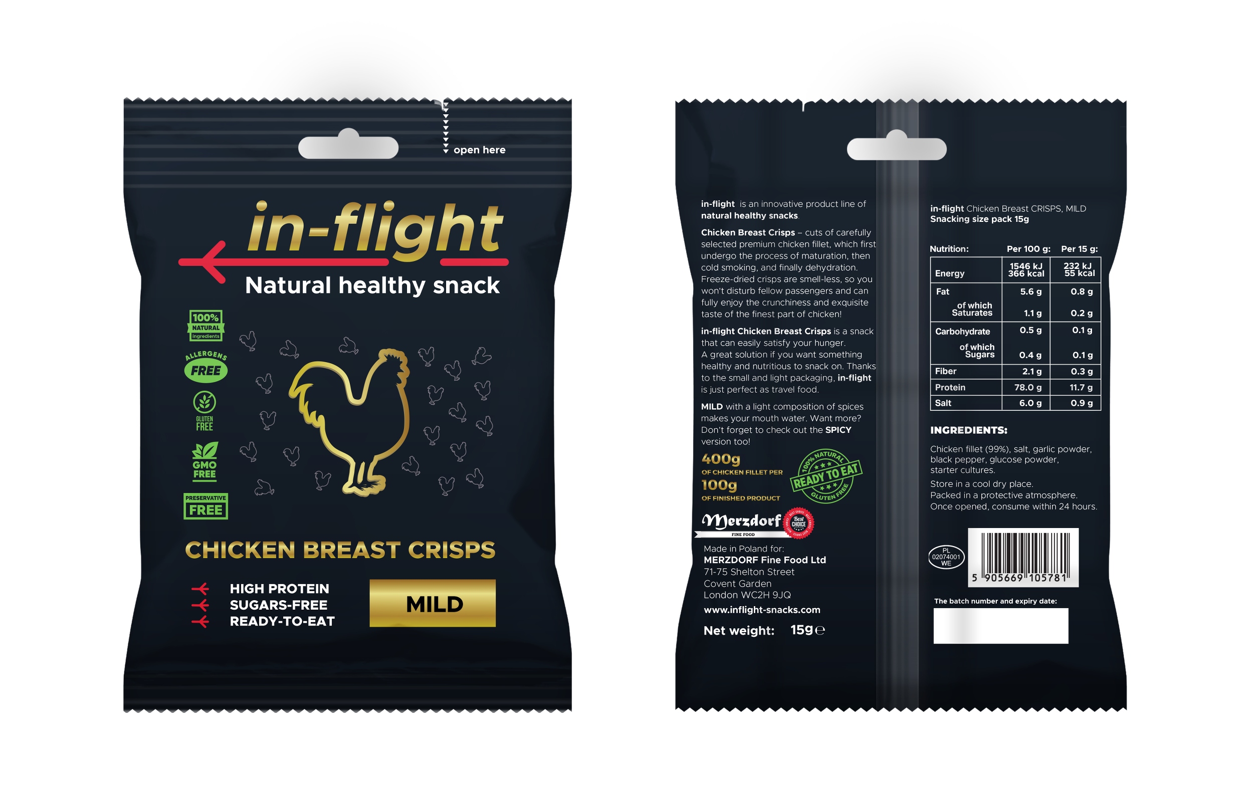 ‘in-flight’ is a truly natural, healthy snack. What makes it unique on the market is the simplest composition possible – 99% is the chicken breast fillet and the remaining 1% make the spices and starter cultures. Furthermore, thanks to the freeze-drying process the snack is four times condensed. That means that in every 100g of finished product there are 400g of chicken fillet! These crisps were not fried or backed, so they are much healthier than ‘traditional’ ones.