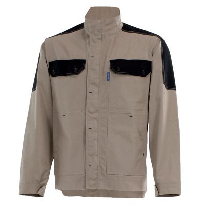 Stand collar with press stud closure | Plastic zip under tab | 2 chest patch pockets with flap fastenings | 1 phone pocket | 1 fastened inside pocket | 2 patch lower pockets | Back vents | Cuffs with press stud fastenings | Shoulder and sleeve panels | Longer back | Plastic haberdashery.