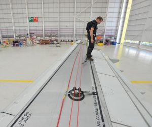 The WinGrip Horizontal Lifeline System allows access for as many as four workers along entire length of a wing or fuselage and is designed for construction, heavier maintenance or return operations. System consists of two end-anchor vacuum pads with twin cables spanning in between, and intermediate anchors used as needed to suit any cable length. Each anchor is positioned and vacuum-locked in place, followed by stainless steel safety cables connected and tensioned at one end.