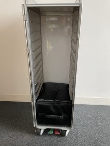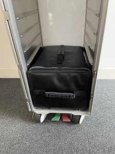 This tamper evident carrier is used to transport and store duty-free items that have been bought by passengers prior to travel. The carrier has been designed with the user in mind. To aid effective storage you can fit 4 carriers in each half cart catering trolley. It is padded to protect the contents and has 4 compartments which can be adjusted to suit whatever item of duty free is being kept inside.
