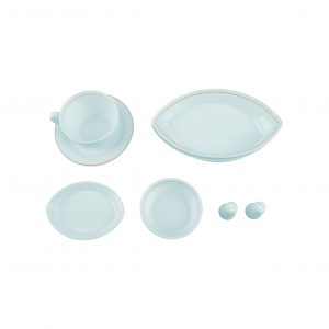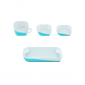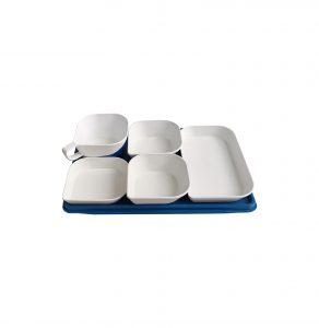 Two Colors, Chic Designs of sustainable used Rotable Coffee Cup/ Salad Bowl/ Side Plate/ Main Plate, served on the Anti-Slip Atlas Tray. ABS Rotable, Tough and Sustainable