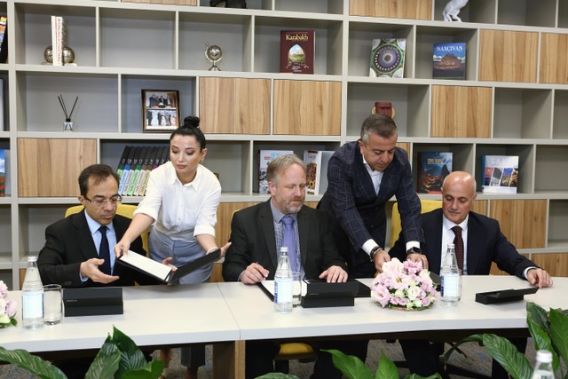 (from left to right): Mirsamad Movsumzade, Senior VP Finance, Silk Way Group, Jitte van den Bout, Head of Commercial, CTS at L3Harris Technologies, Adalat Samedov, First Vice-Rector, National Aviation Academy. Image Source: Silk Way West Airlines