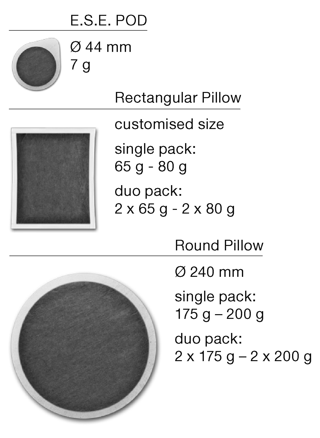 - Easy Serving Espresso pods (E.S.E. Standard) (7 g portions, individually packed in a protective atmosphere in polyaluvel foil)